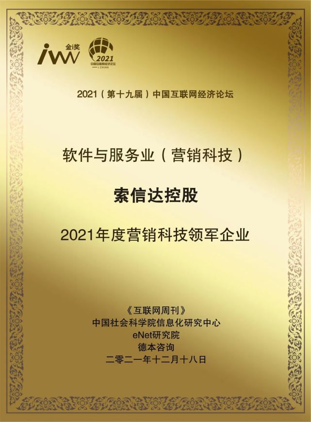 金i獎由中國科學院主管的《互聯網周刊》聯合中國社會科學院信息化研究中心、eNet研究院、德本諮詢共同評選,歷來被業內視為代表互聯網產業發展創新的風向標。索信達憑藉卓越的智能營銷科技能力以及深刻的行業洞見、戰略性的產品思維、領先的平台架構,獲頒“2021年度營銷科技領軍企業”。